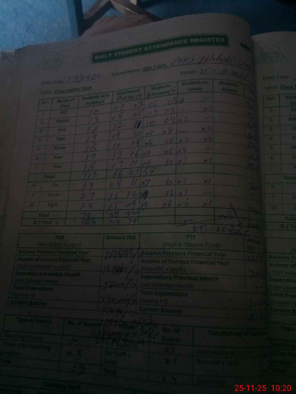 | Total no. of Classrooms: 13 No. of Classrooms Used for Teaching: 10 No. of Classrooms Storing Old Furniture, FTBs, etc: 0Comments if Any: 0 |