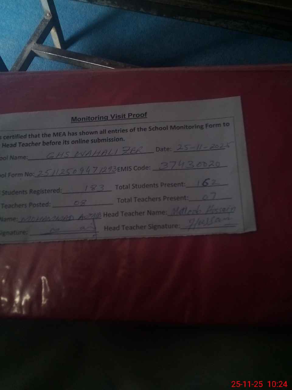 | Attendance Register | Head Teacher | MEA with School | Visit Proof |