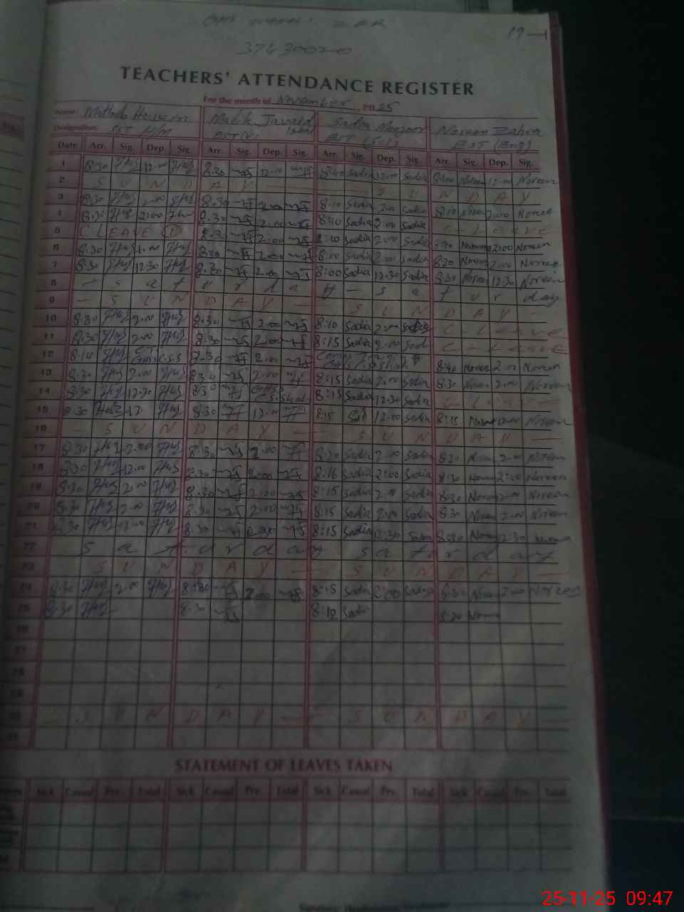 | CNIC | Full Name | Designation | R/C | Absence During Last Calender Month |