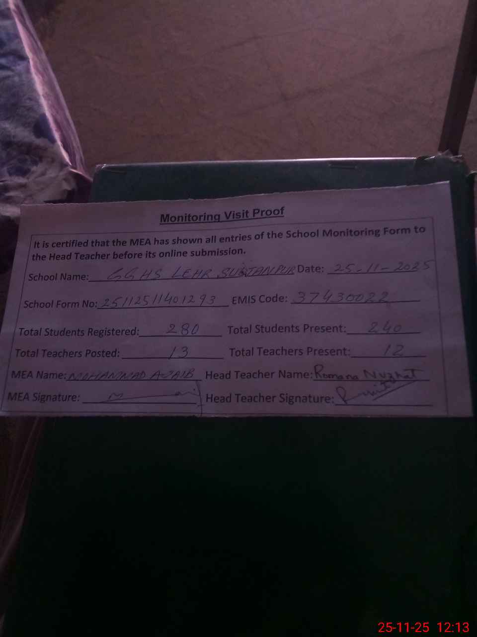 | Attendance Register | Head Teacher | MEA with School | Visit Proof |