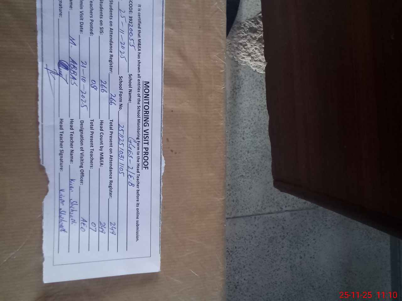 | Attendance Register | Head Teacher | MEA with School | Visit Proof |