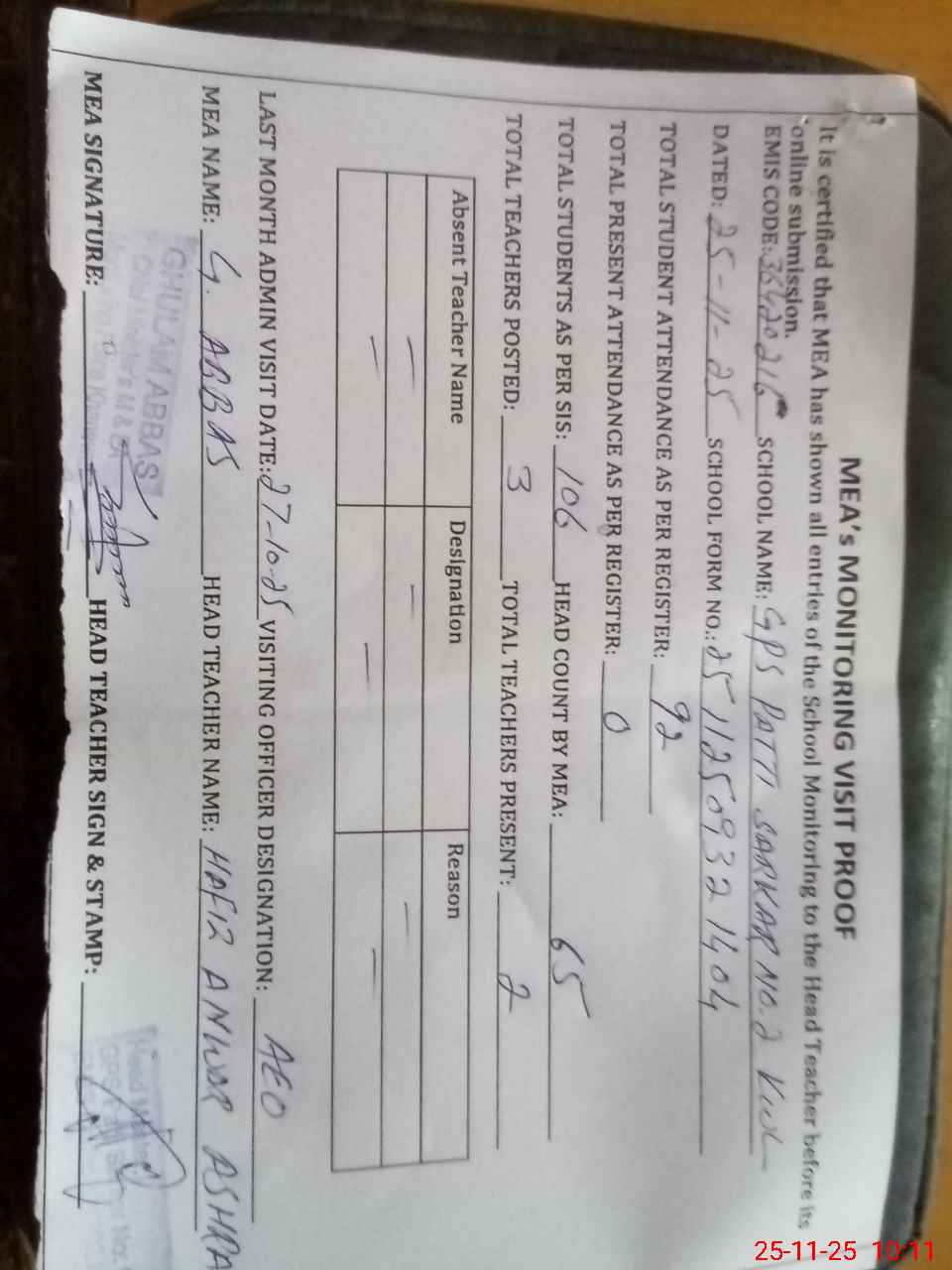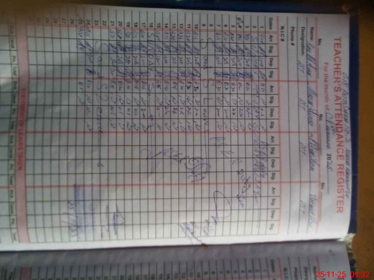 | Remarks (Use Separate Page if Required): nursery class and one class attandance register not maintained for November 2025 attandance of students not marked of all classes for today on attandance register | |||||