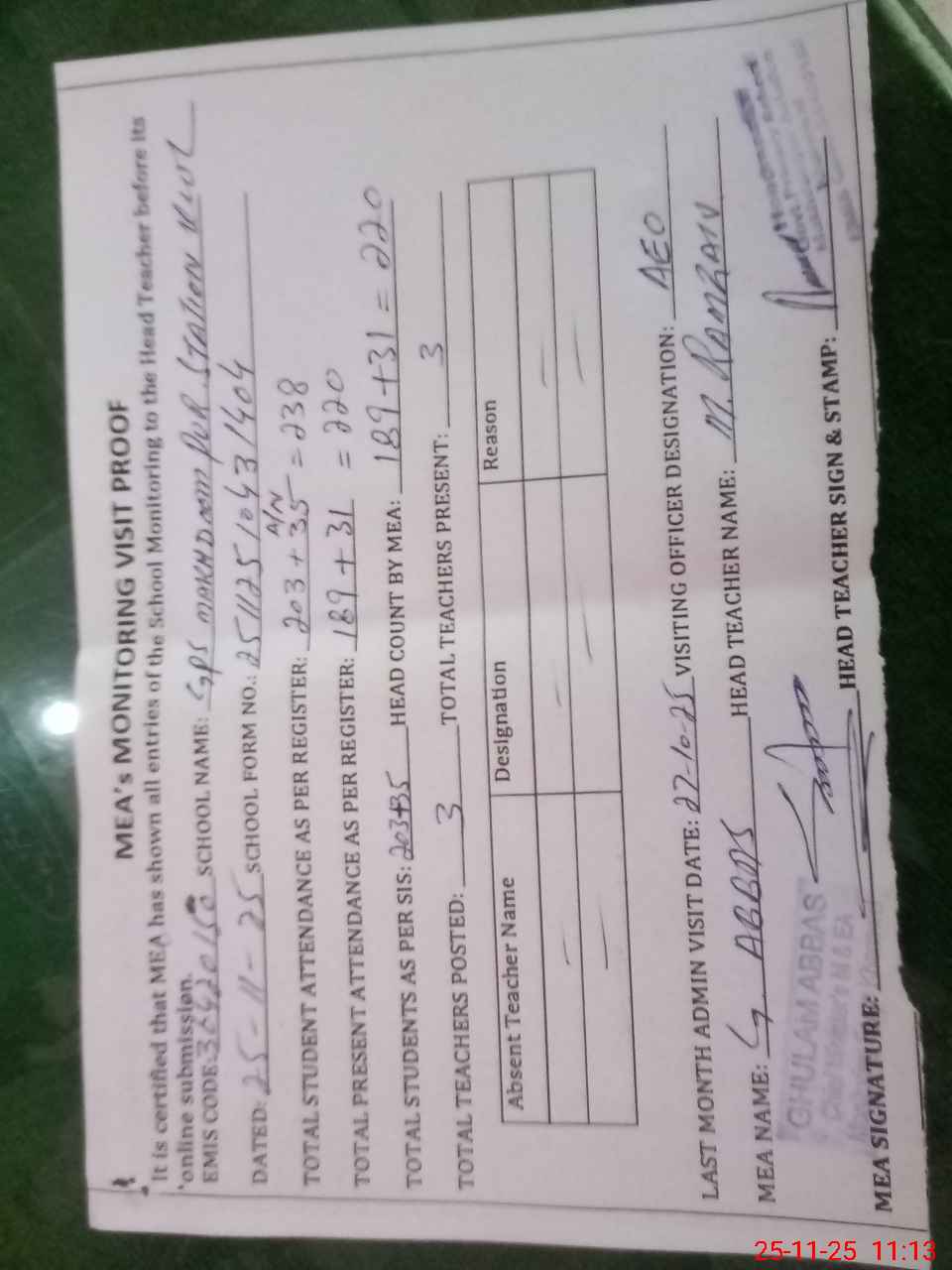 | Attendance Register | Head Teacher | MEA with School | Visit Proof |