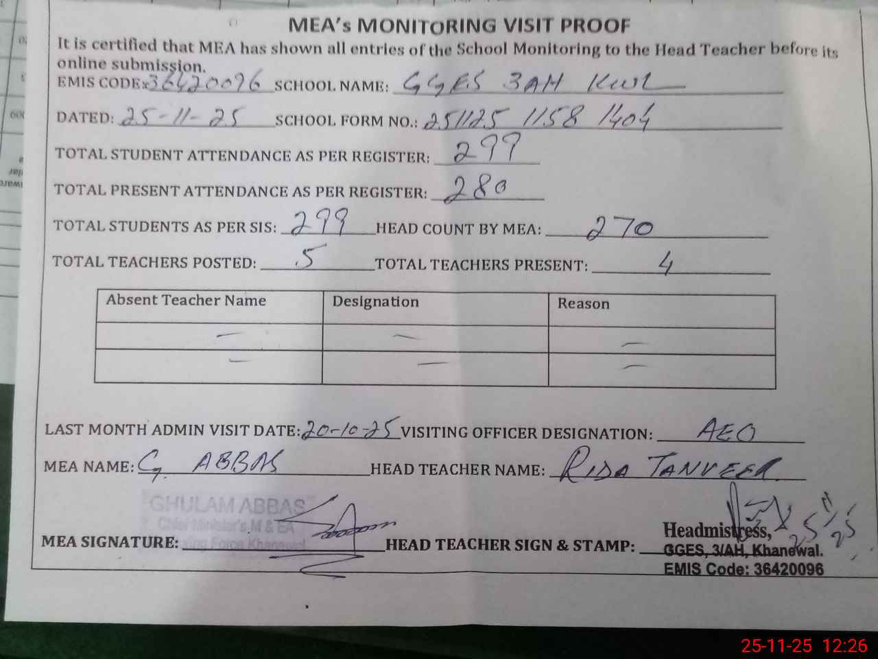 | Attendance Register | Head Teacher | MEA with School | Visit Proof |