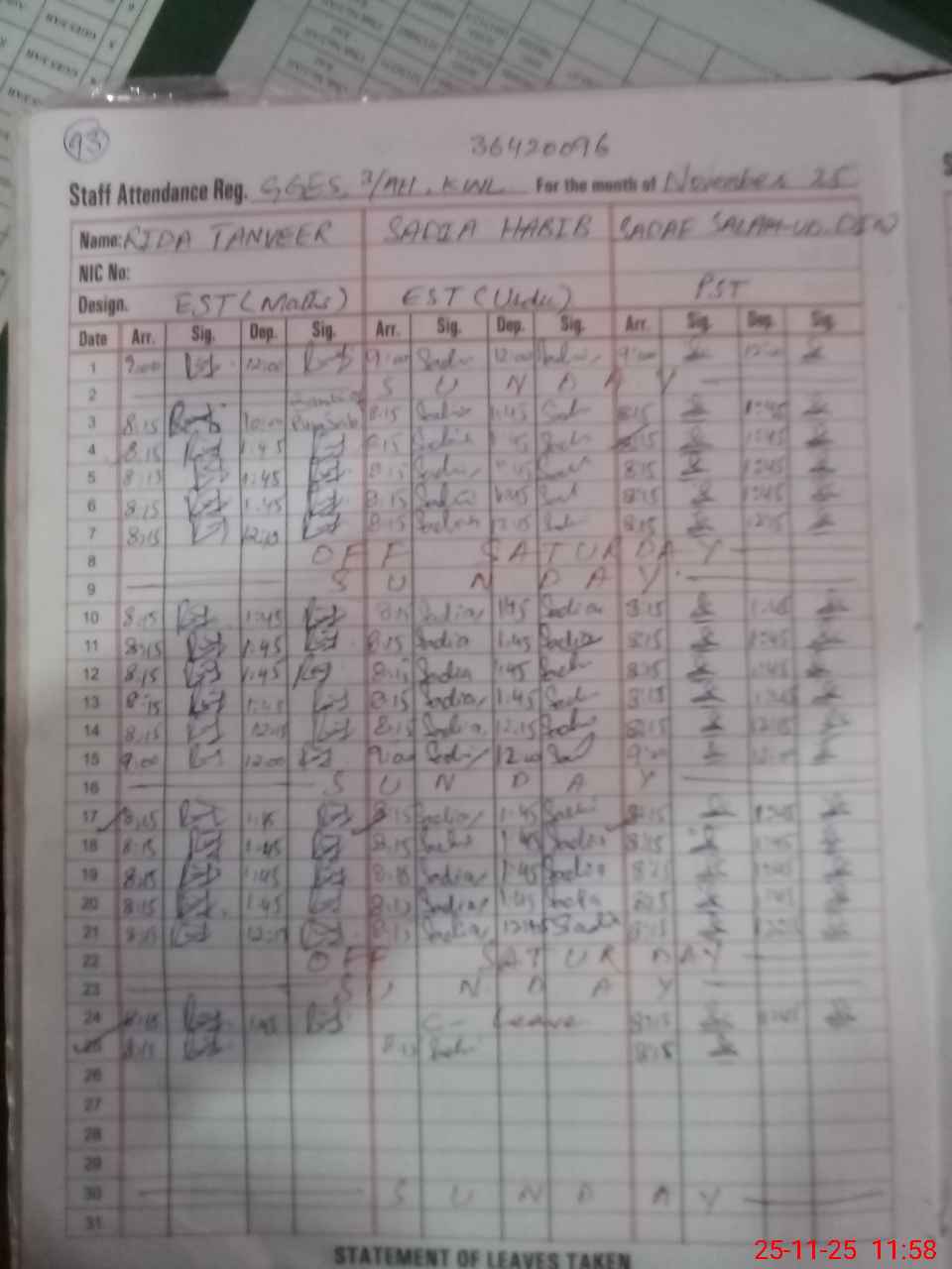 | CNIC | Full Name | Designation | R/C | Absence During Last Calender Month |
