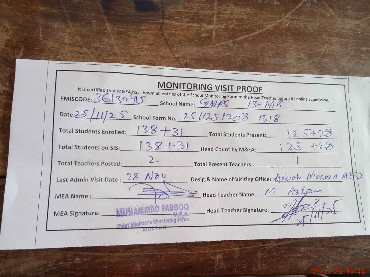 | Attendance Register | Head Teacher | MEA with School | Visit Proof |