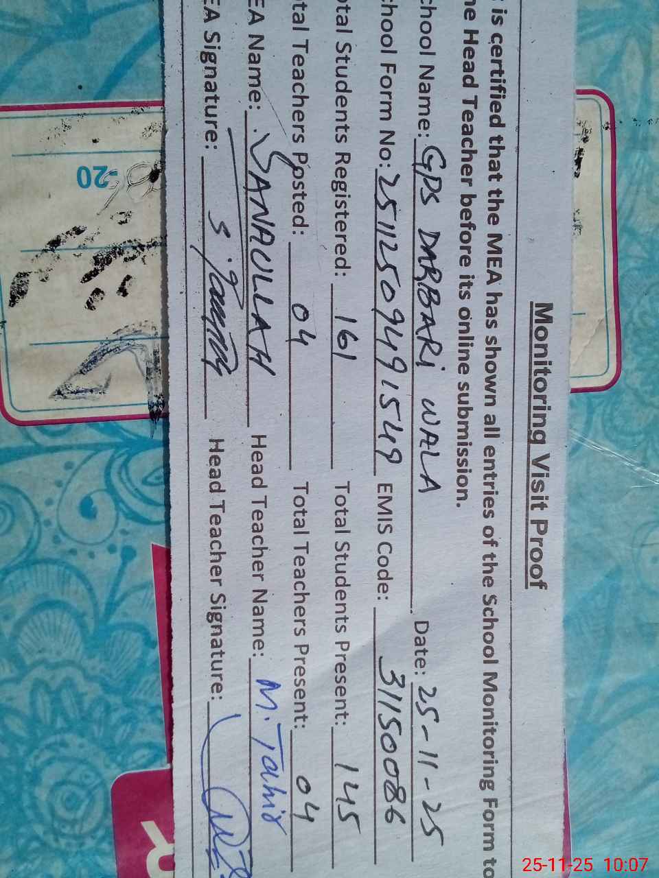 | Attendance Register | Head Teacher | MEA with School | Visit Proof |