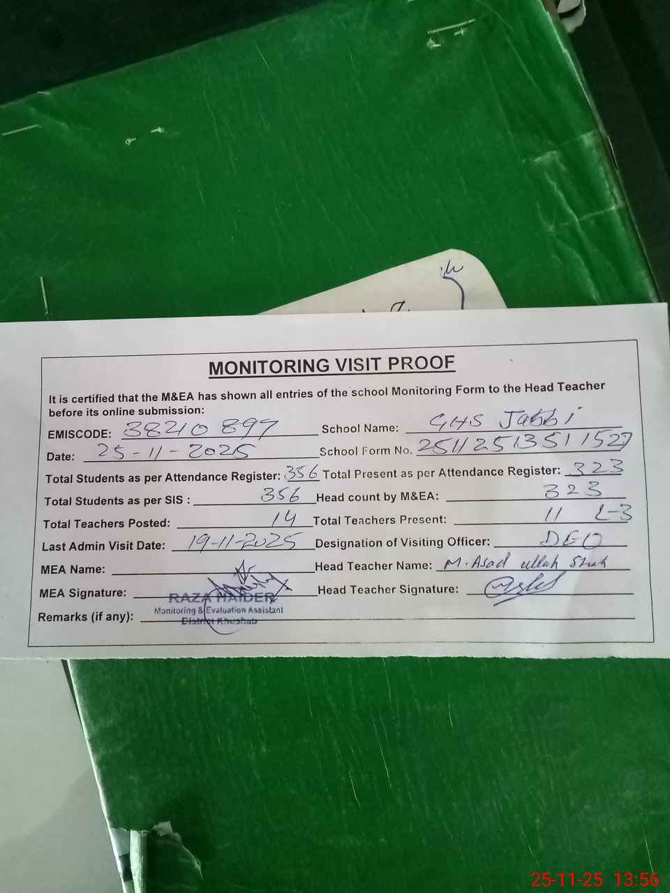 | Attendance Register | Head Teacher | MEA with School | Visit Proof |
