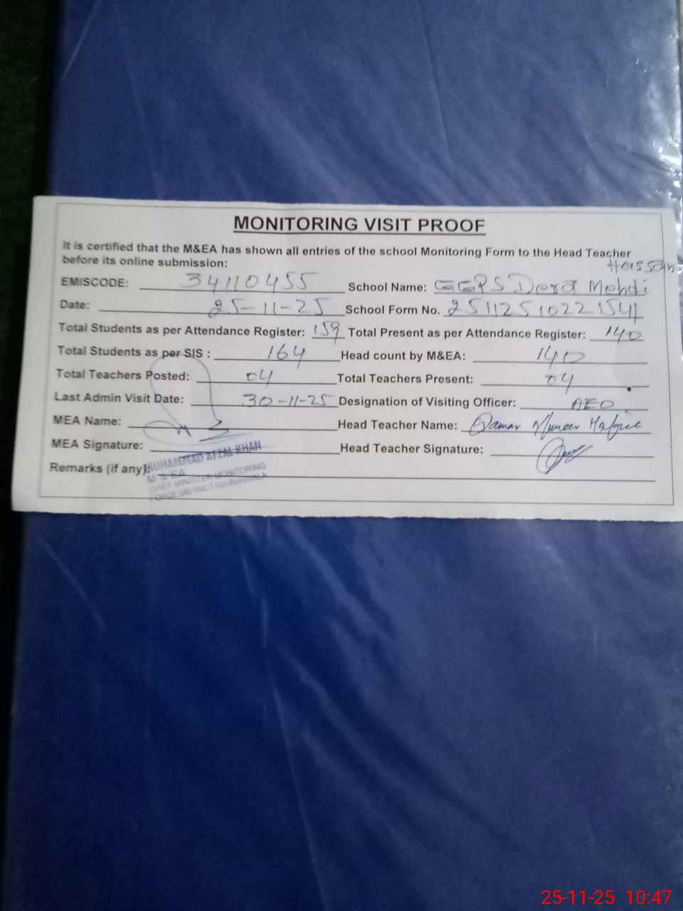 | Attendance Register | Head Teacher | MEA with School | Visit Proof |