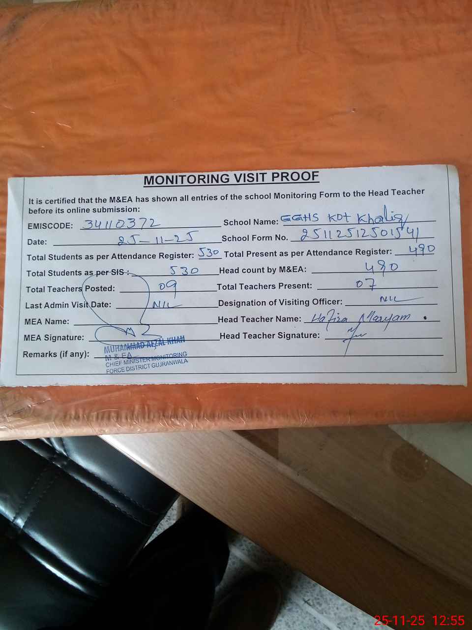| Attendance Register | Head Teacher | MEA with School | Visit Proof |
