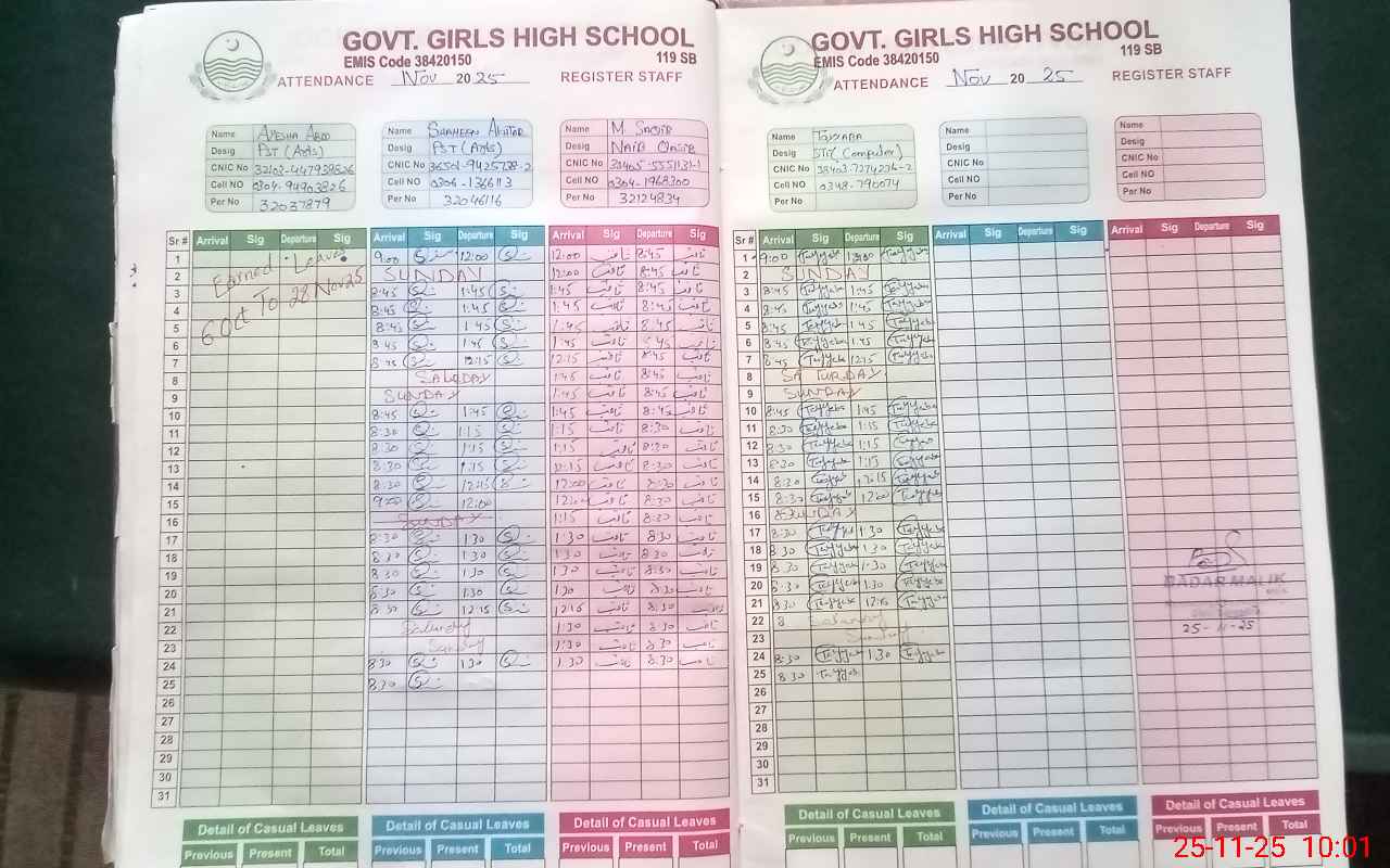 | CNIC | Full Name | Designation | R/C | Absence During Last Calender Month |