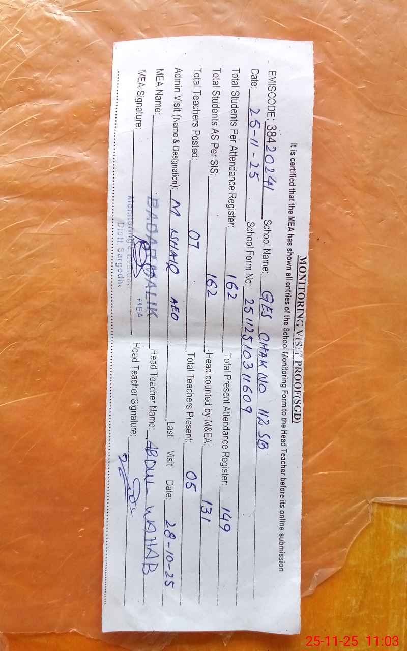 | EMIS Code: 38420241 | Name of School: GES CHAK NO.112 SB | |||