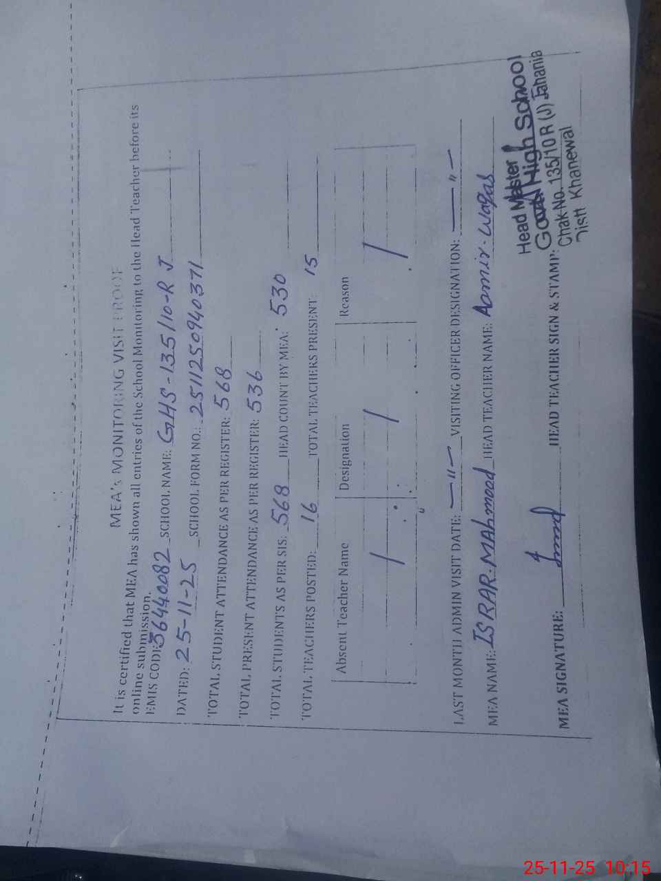 | Attendance Register | Head Teacher | MEA with School | Visit Proof |