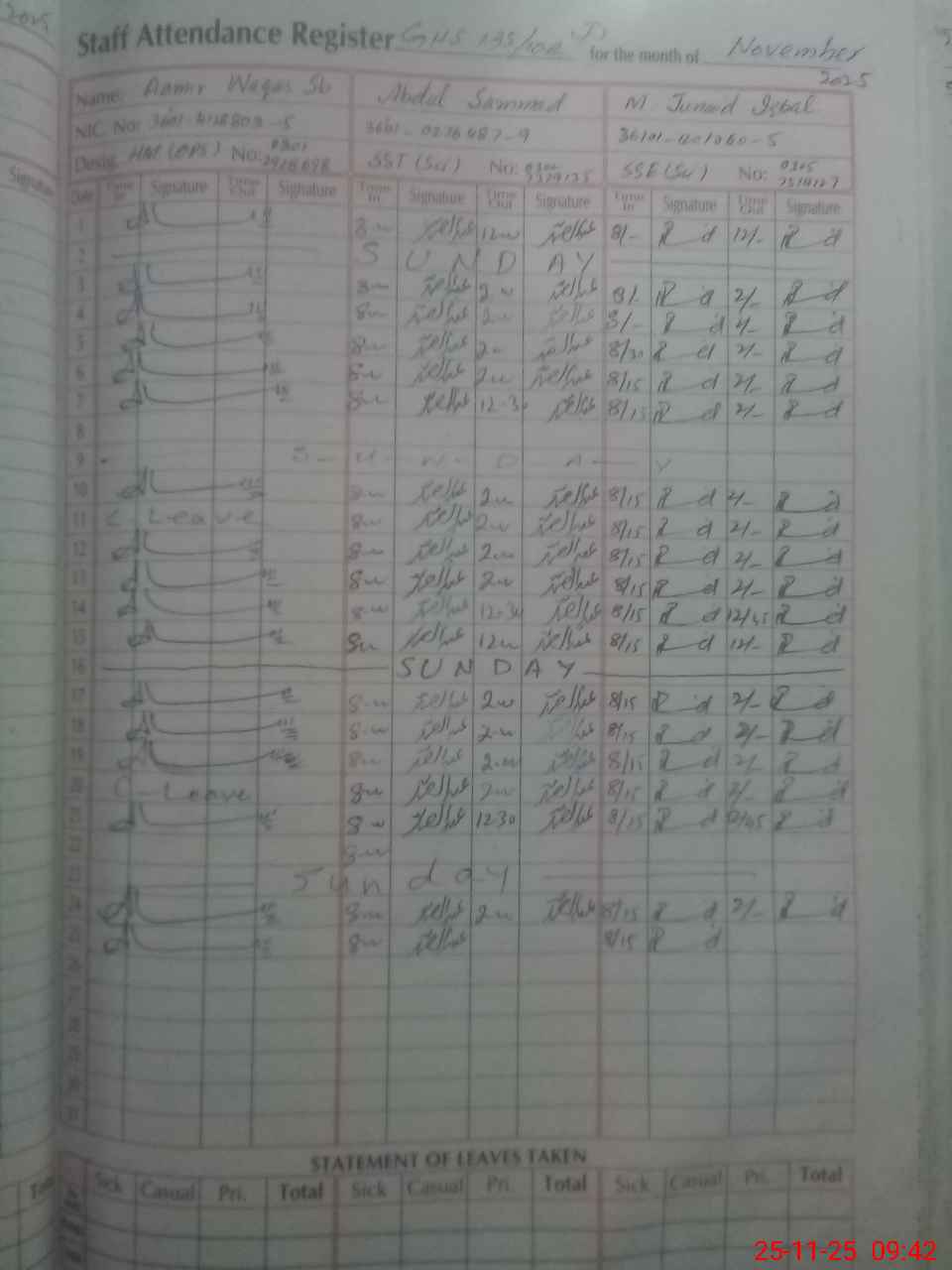 | CNIC | Full Name | Designation | R/C | Absence during last cal. month |