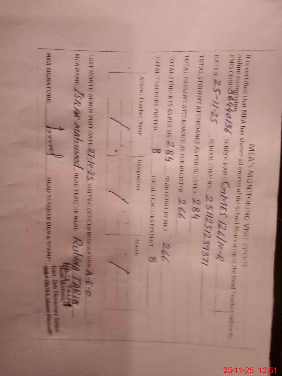 | Attendance Register | Head Teacher | MEA with School | Visit Proof |