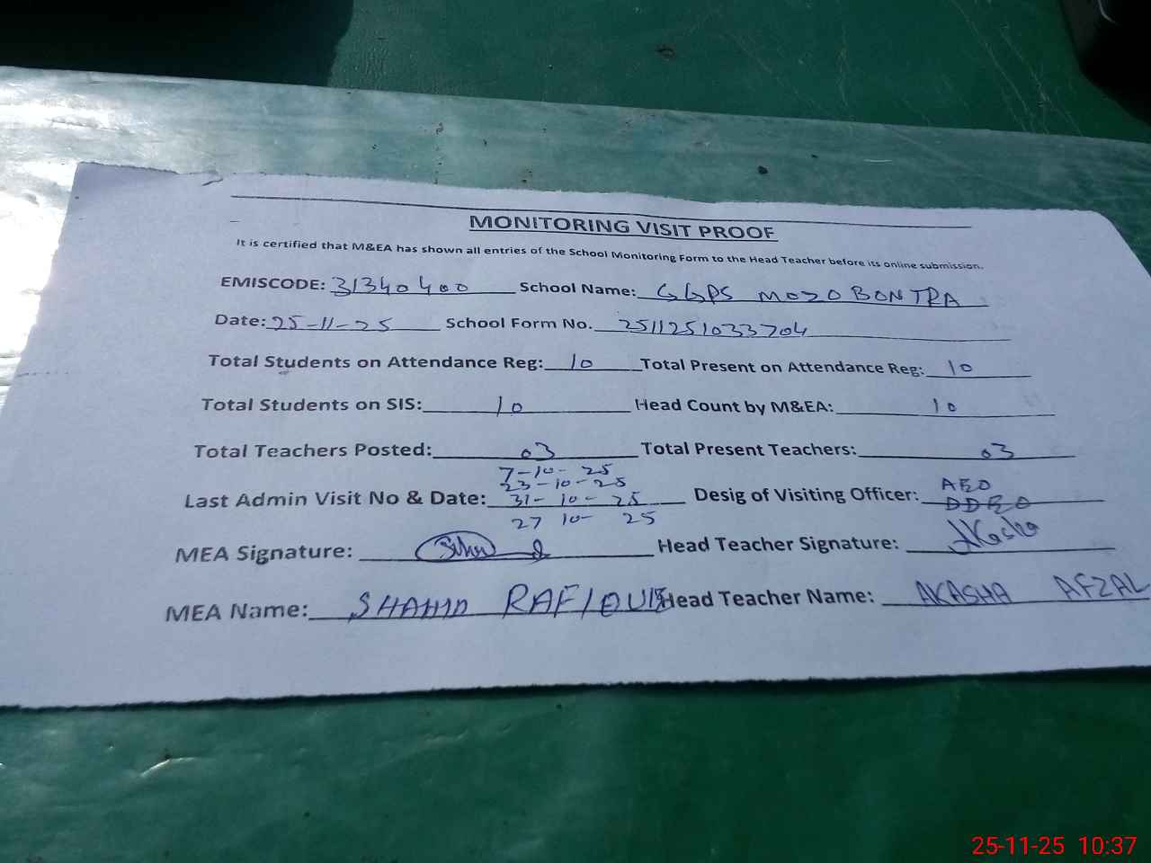 | Monitoring Date: 25-11-2025 | Start Time: 25-11-2025 10:00 AM | End Time: 25-11-2025 10:38 AM | Name of MEA: Sh**** Ra**** | |