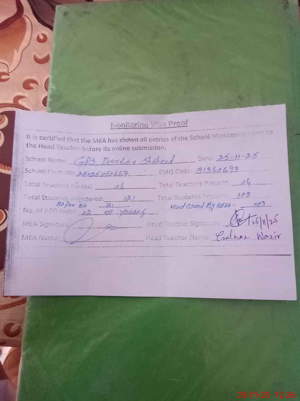 | Attendance Register | Head Teacher | MEA with School | Visit Proof |