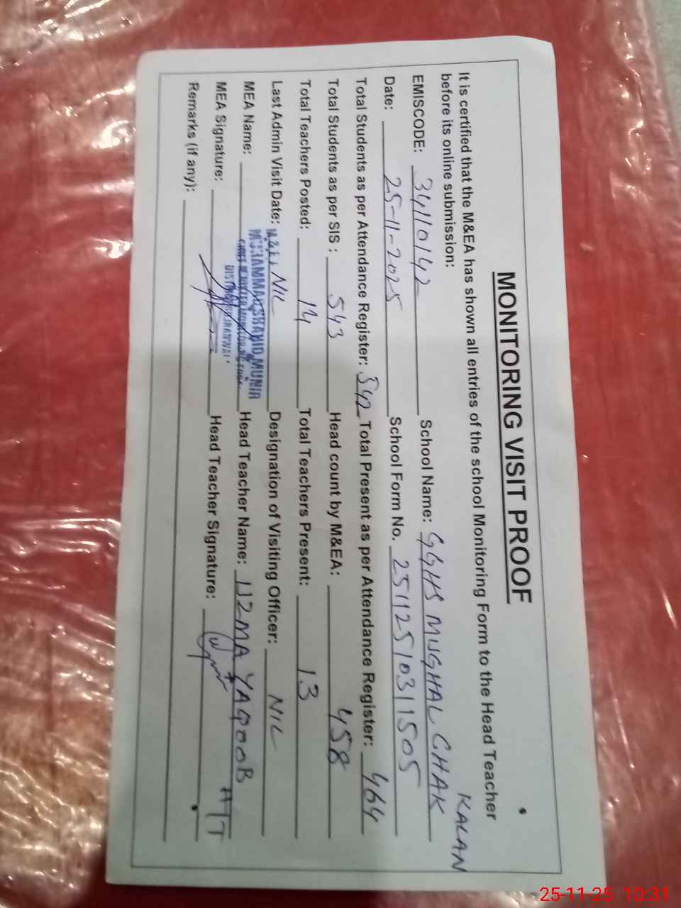 | Attendance Register | Head Teacher | MEA with School | Visit Proof |