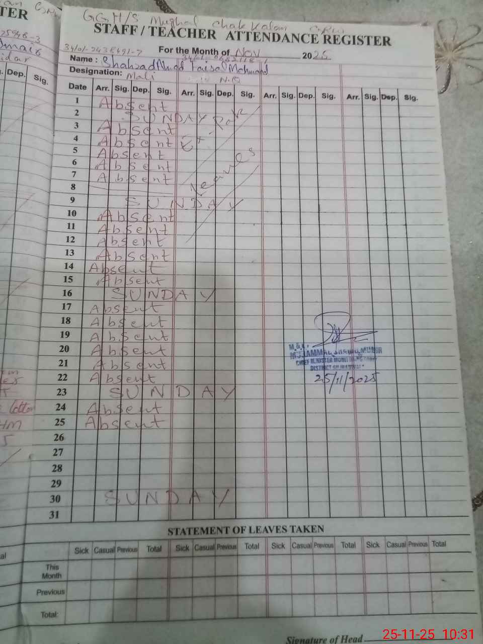 | 34**** | Sh**** Ah**** | MALI | 0 | 0 | 0 | 0 | 0 | 0 | 0 | 0 | 0 | Absent (Un-Authorized) | |