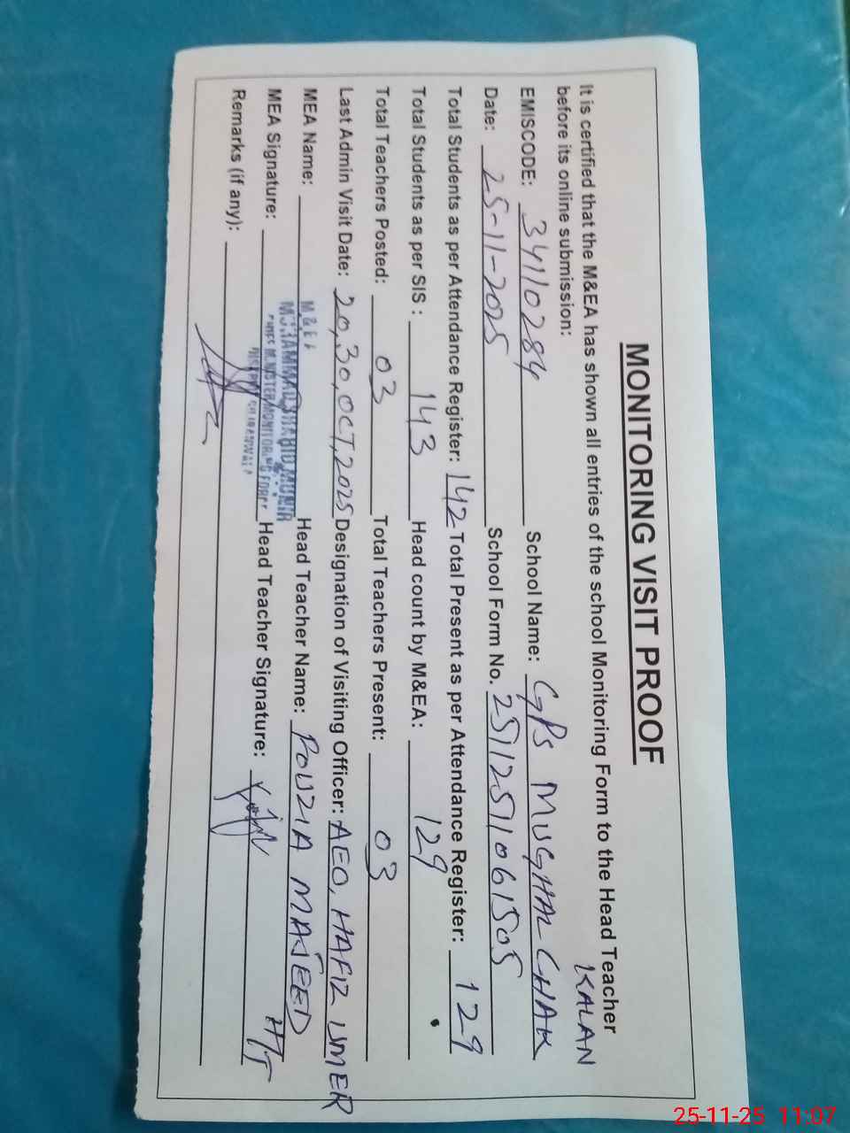 | Attendance Register | Head Teacher | MEA with School | Visit Proof |