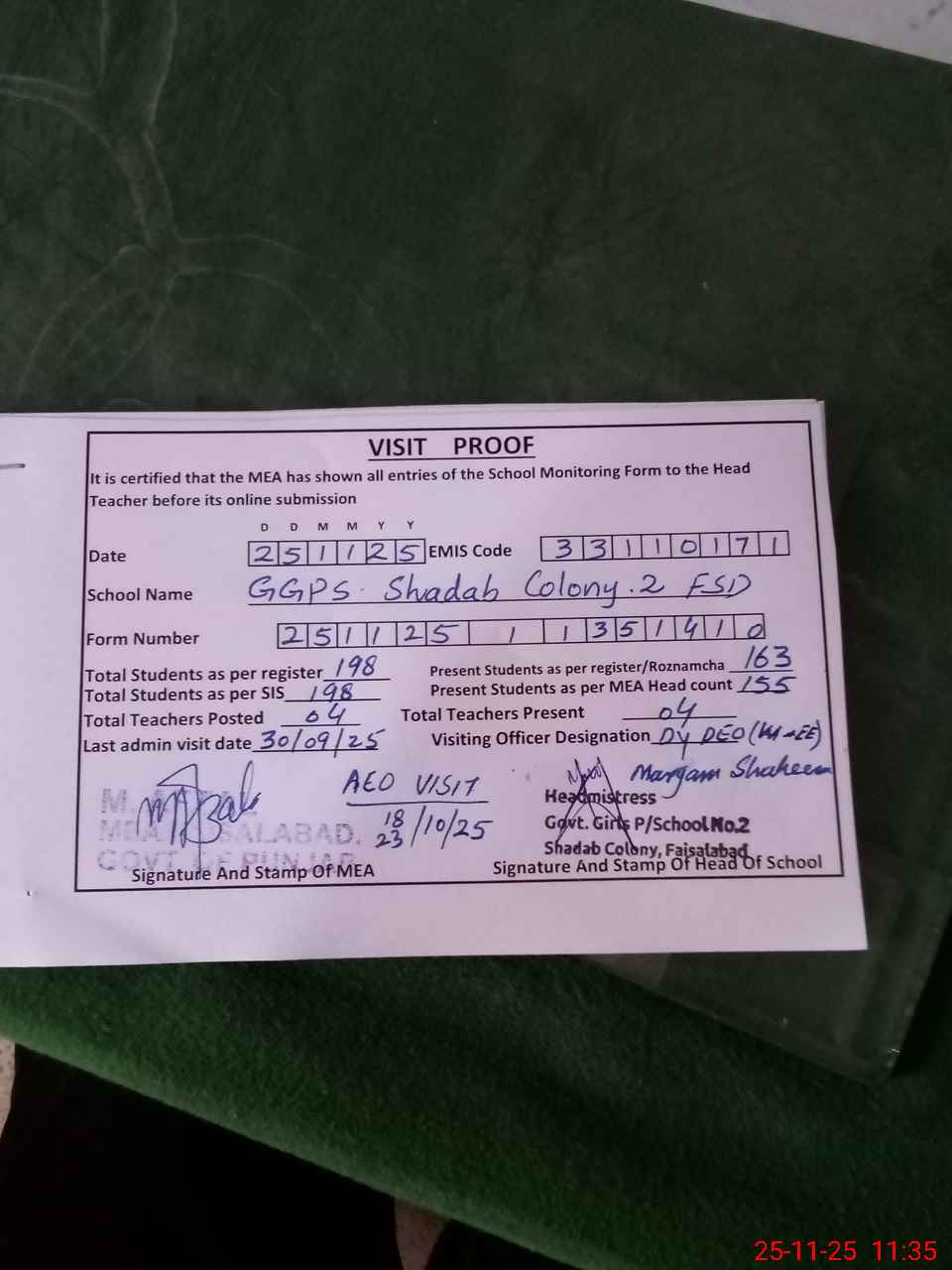 | EMIS Code: 33110171 | Name of School: GGPS SHADAB COLONY 2 | |||