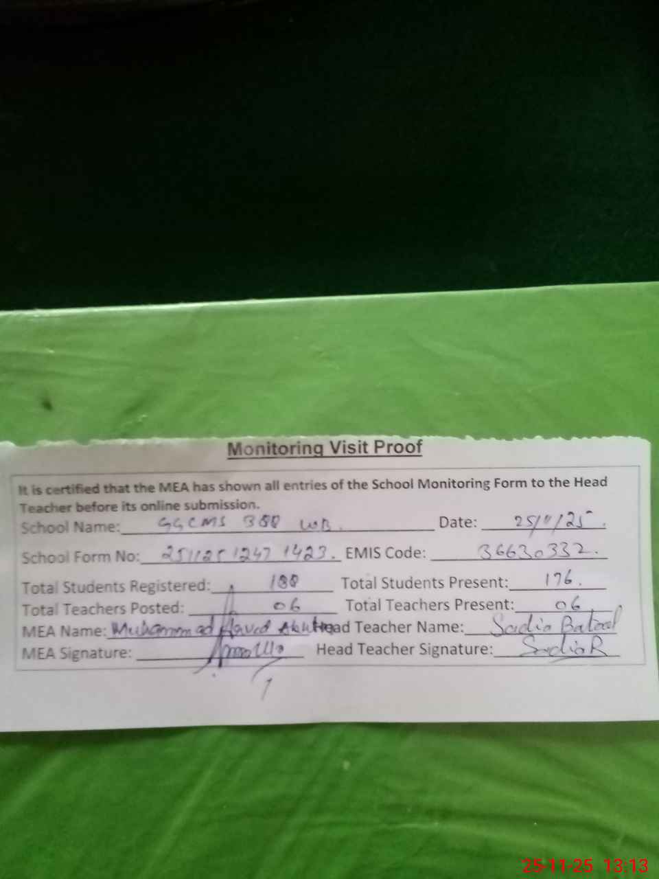| Attendance Register | Head Teacher | MEA with School | Visit Proof |
