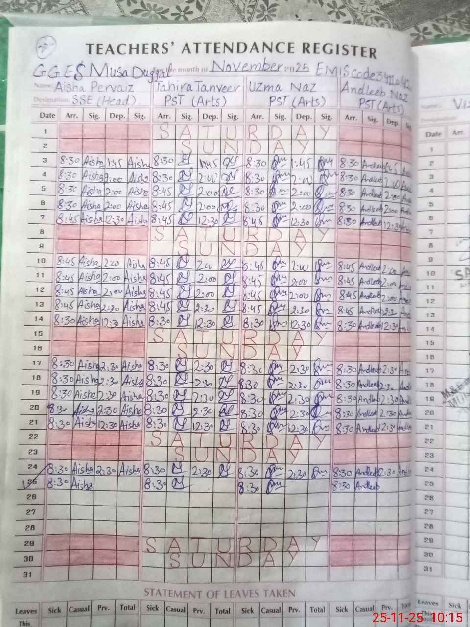 | Leave | Duty | Absent | Maternity | Medical | Ex- Pak |