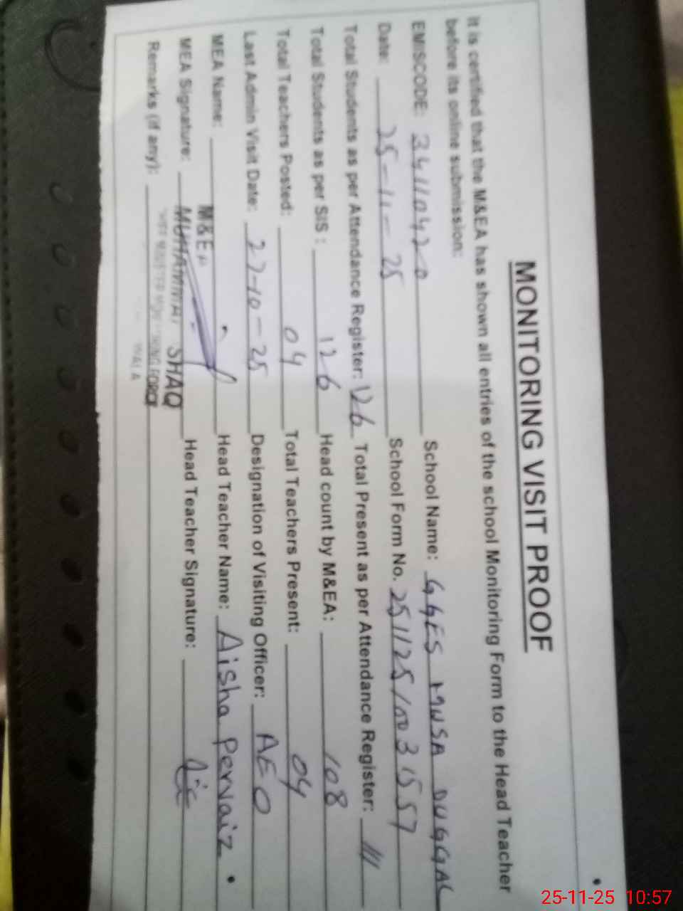 | Attendance Register | Head Teacher | MEA with School | Visit Proof |