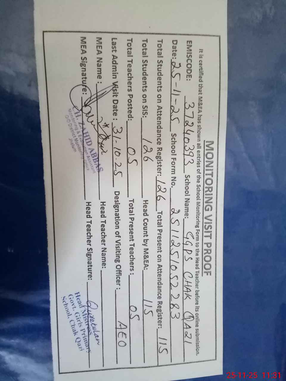 | Attendance Register | Head Teacher | MEA with School | Visit Proof |