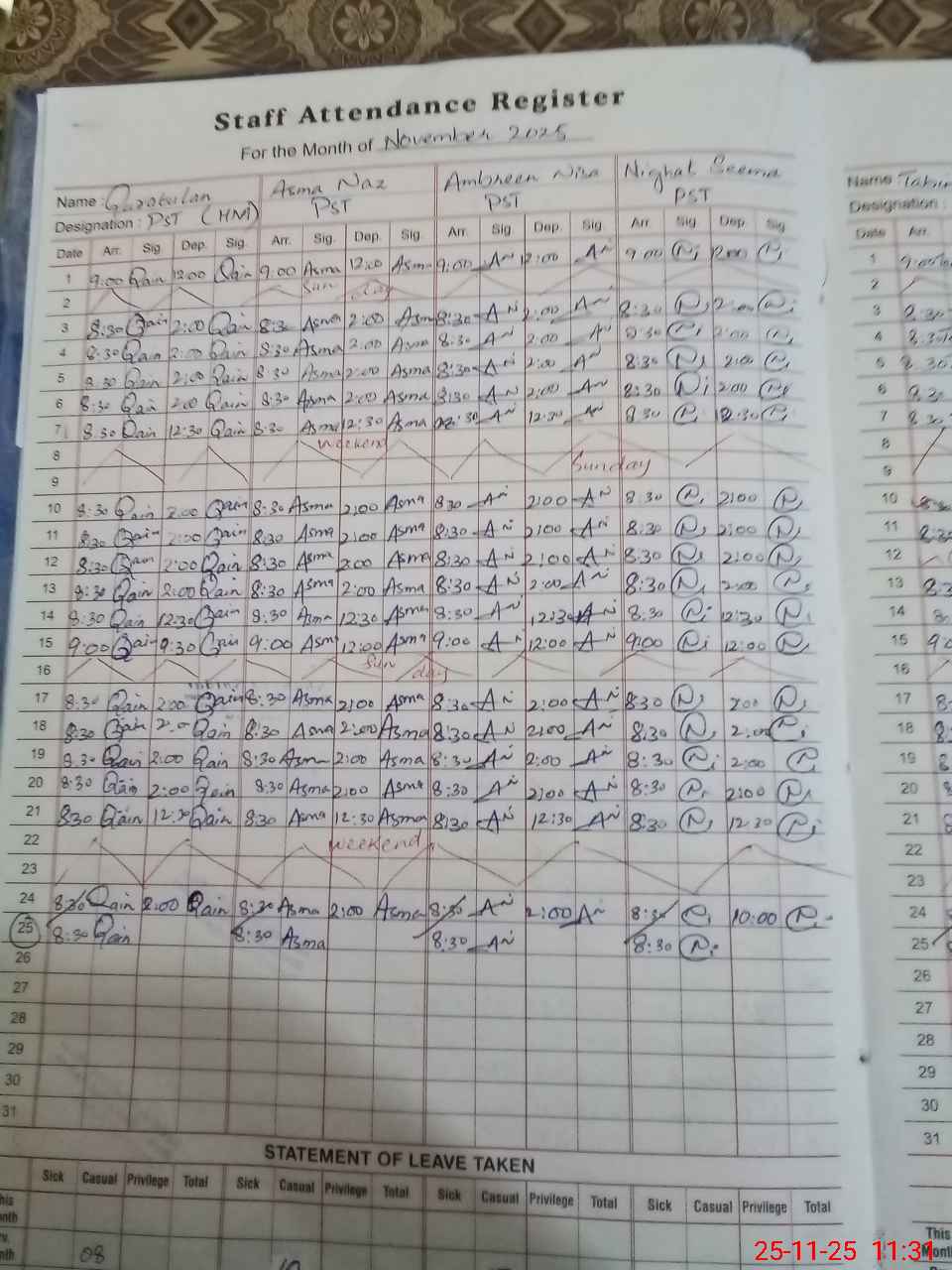 | Leave | Duty | Absent | Maternity | Medical | Ex- Pak |