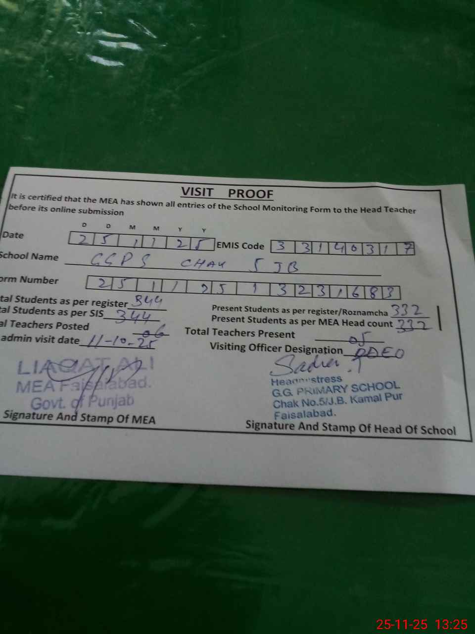 | Attendance Register | Head Teacher | MEA with School | Visit Proof |
