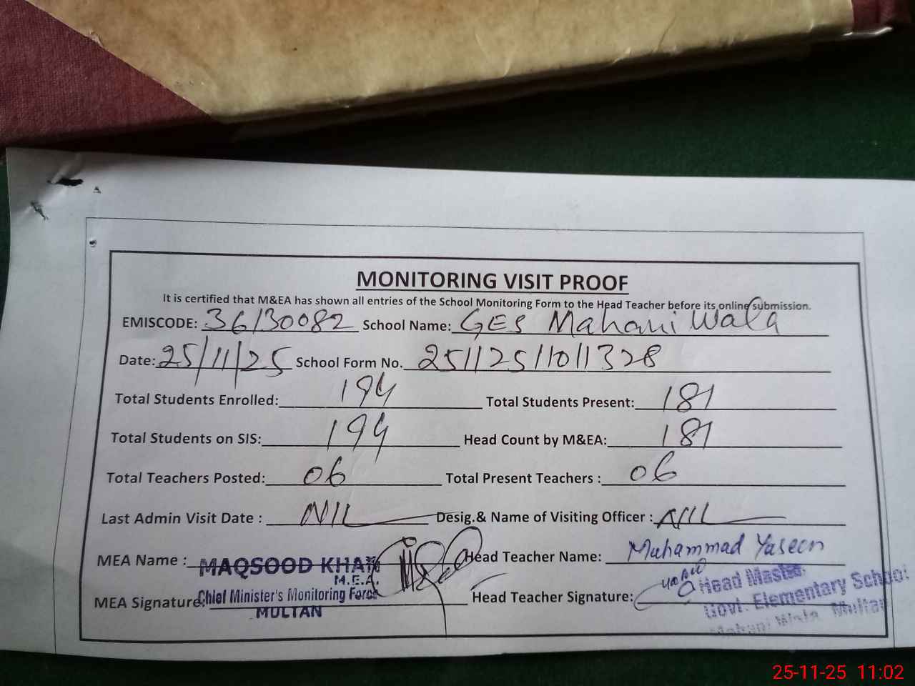 | EMIS Code: 36130082 | Name of School: GES MAHANI WALA MOZA CHATTA | |||