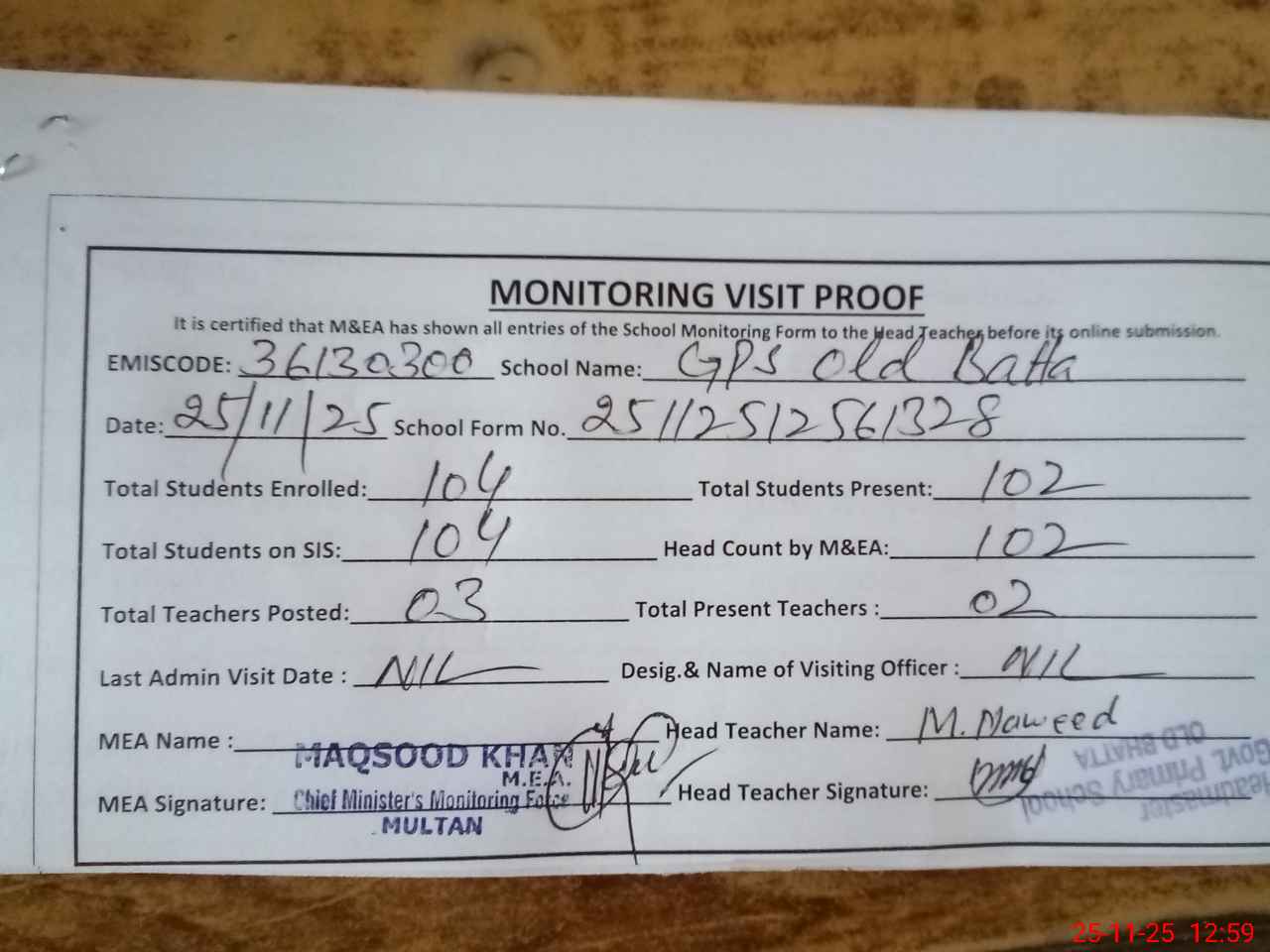 | Attendance Register | Head Teacher | MEA with School | Visit Proof |