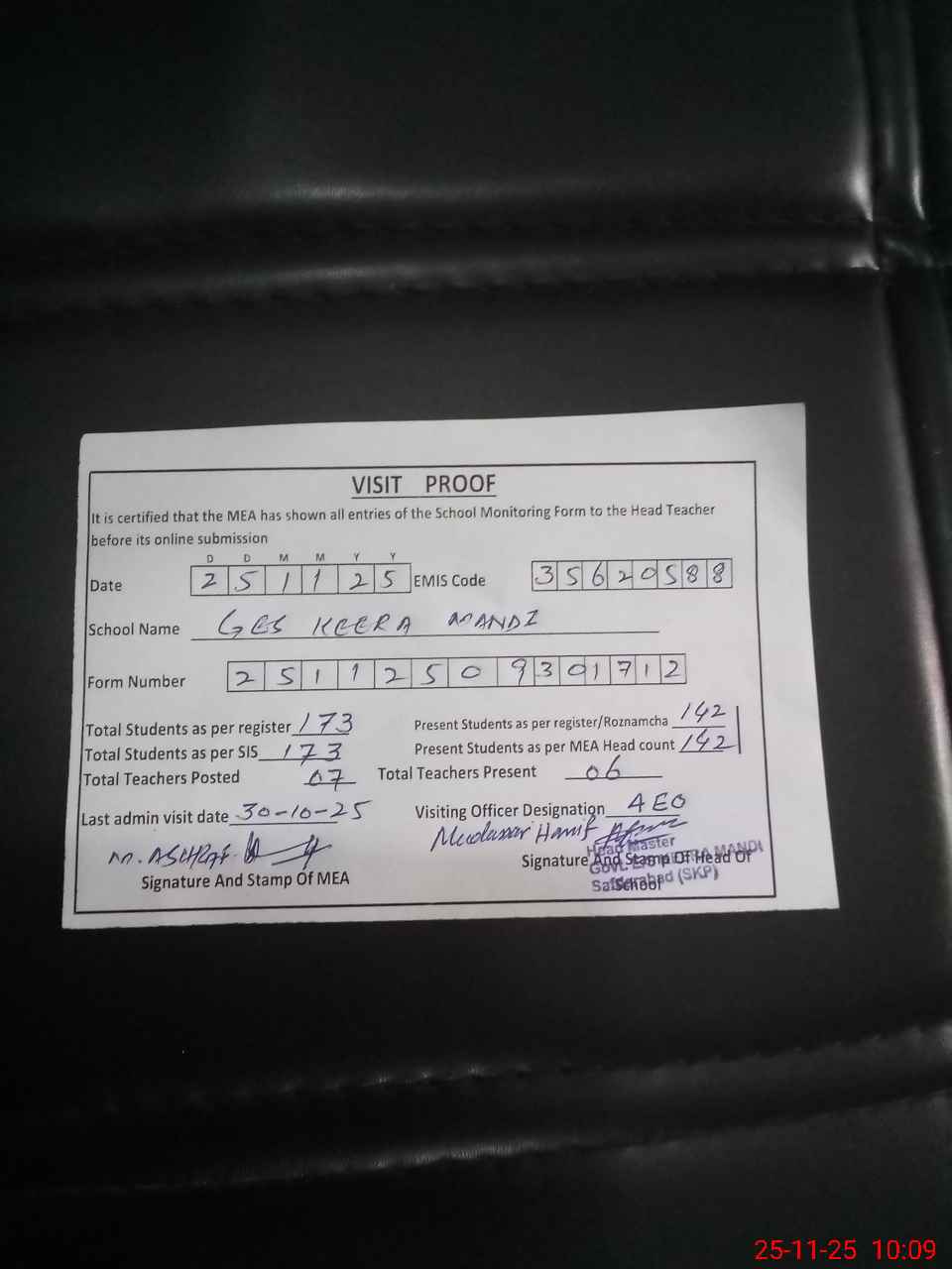 | Attendance Register | Head Teacher | MEA with School | Visit Proof |