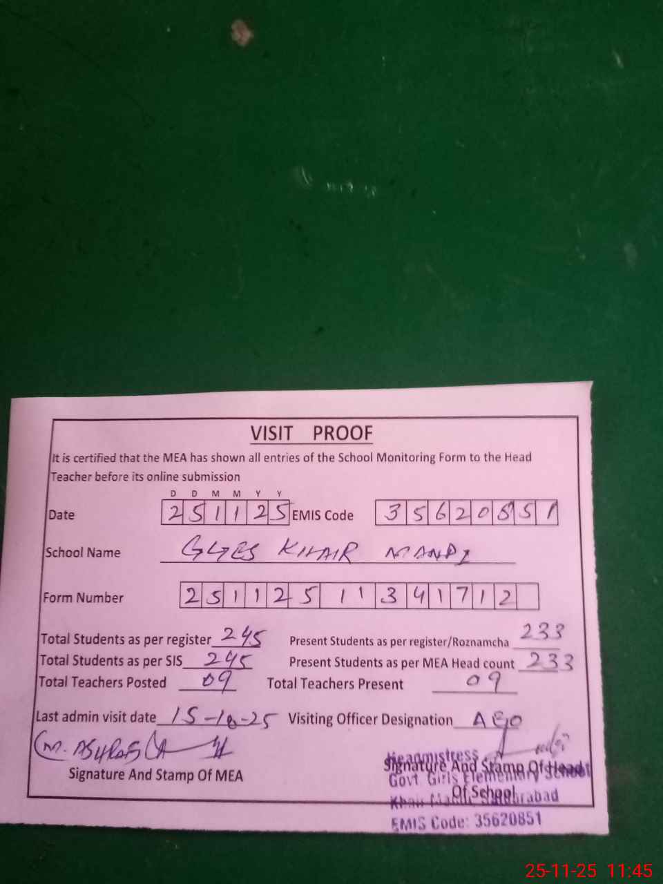 | Attendance Register | Head Teacher | MEA with School | Visit Proof |