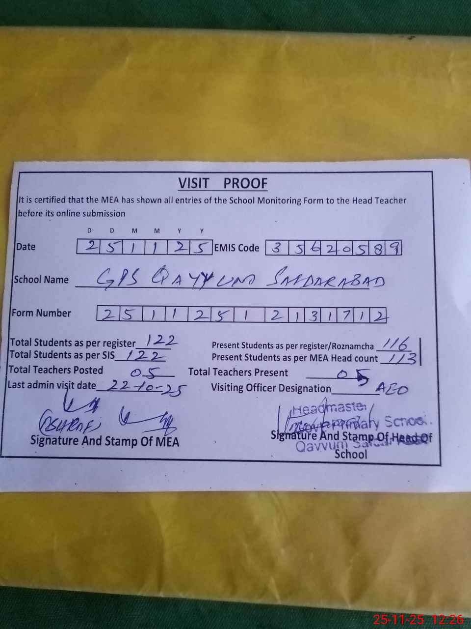 | Attendance Register | Head Teacher | MEA with School | Visit Proof |