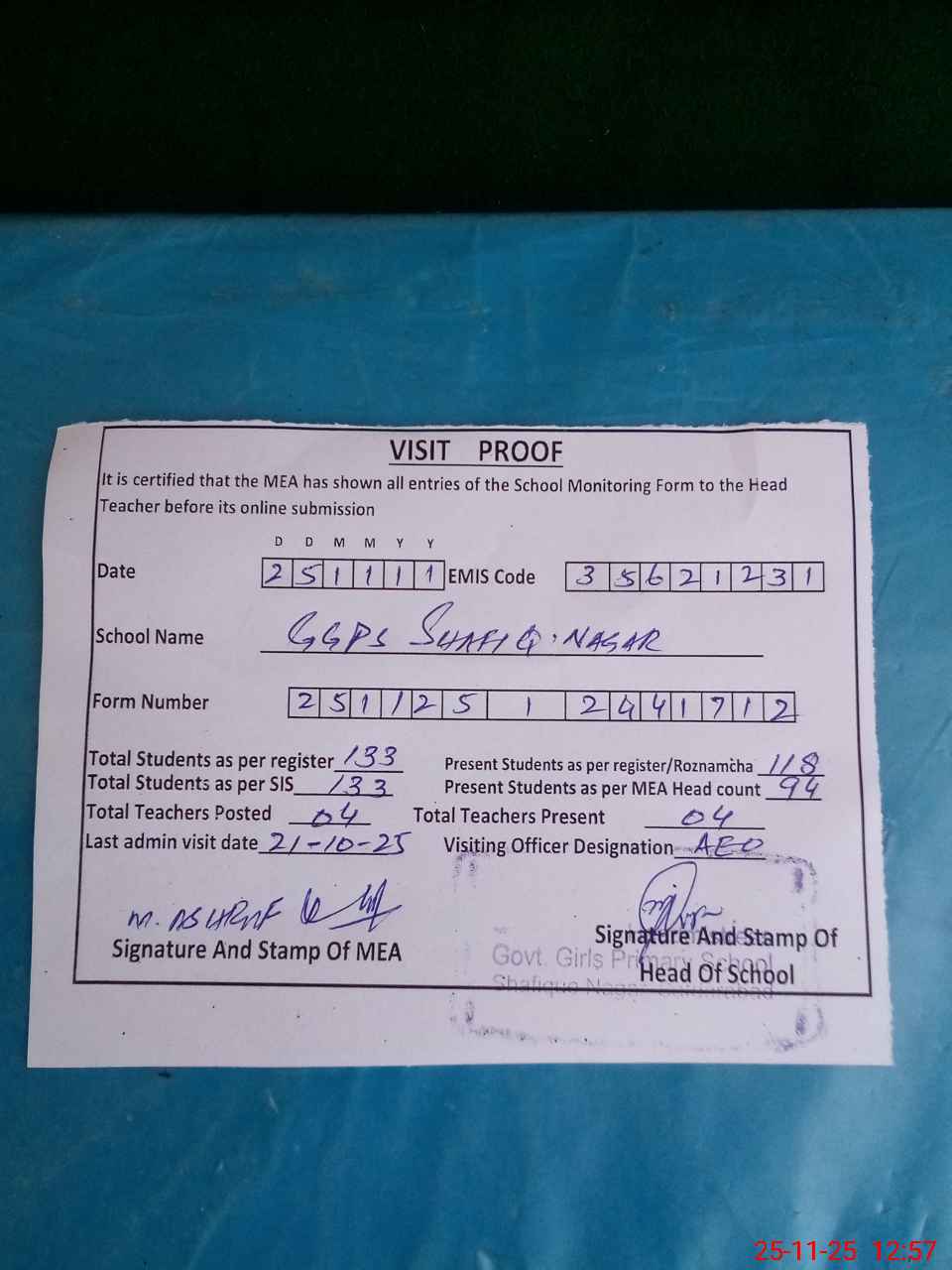 | Attendance Register | Head Teacher | MEA with School | Visit Proof |