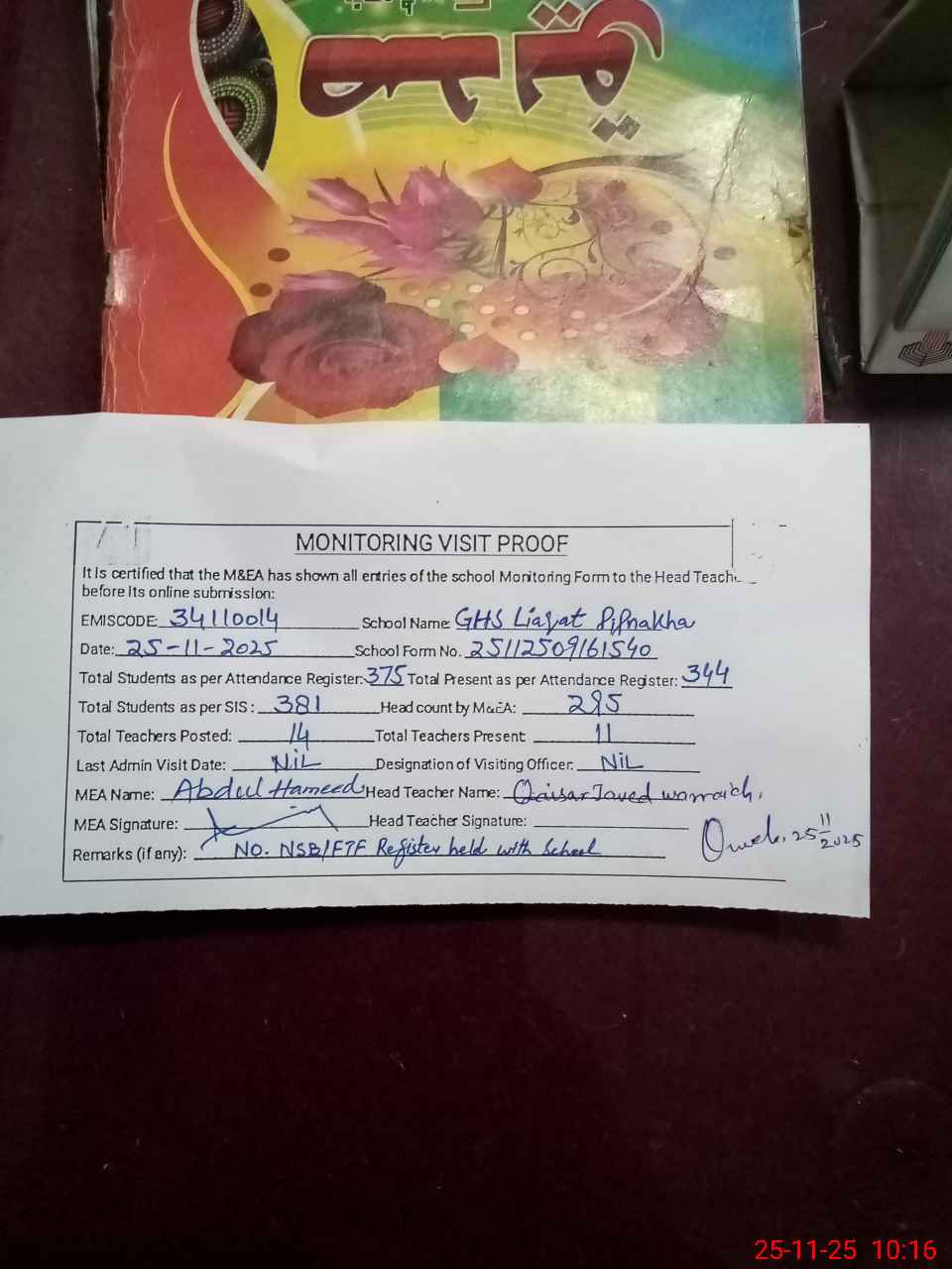 | Attendance Register | Head Teacher | MEA with School | Visit Proof |