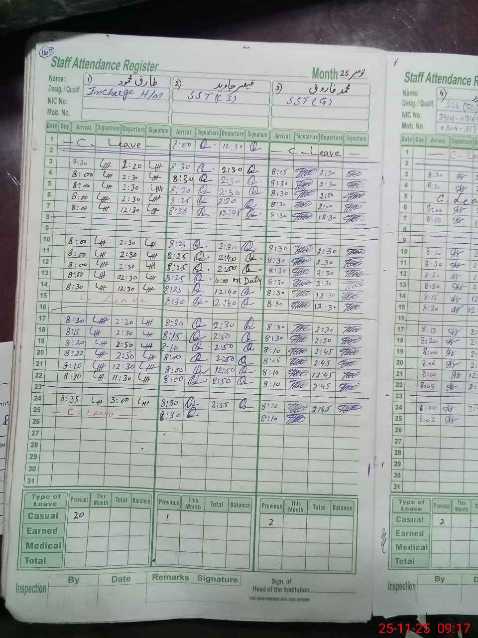 | CNIC | Full Name | Designation | R/C | Absence during last cal. month |