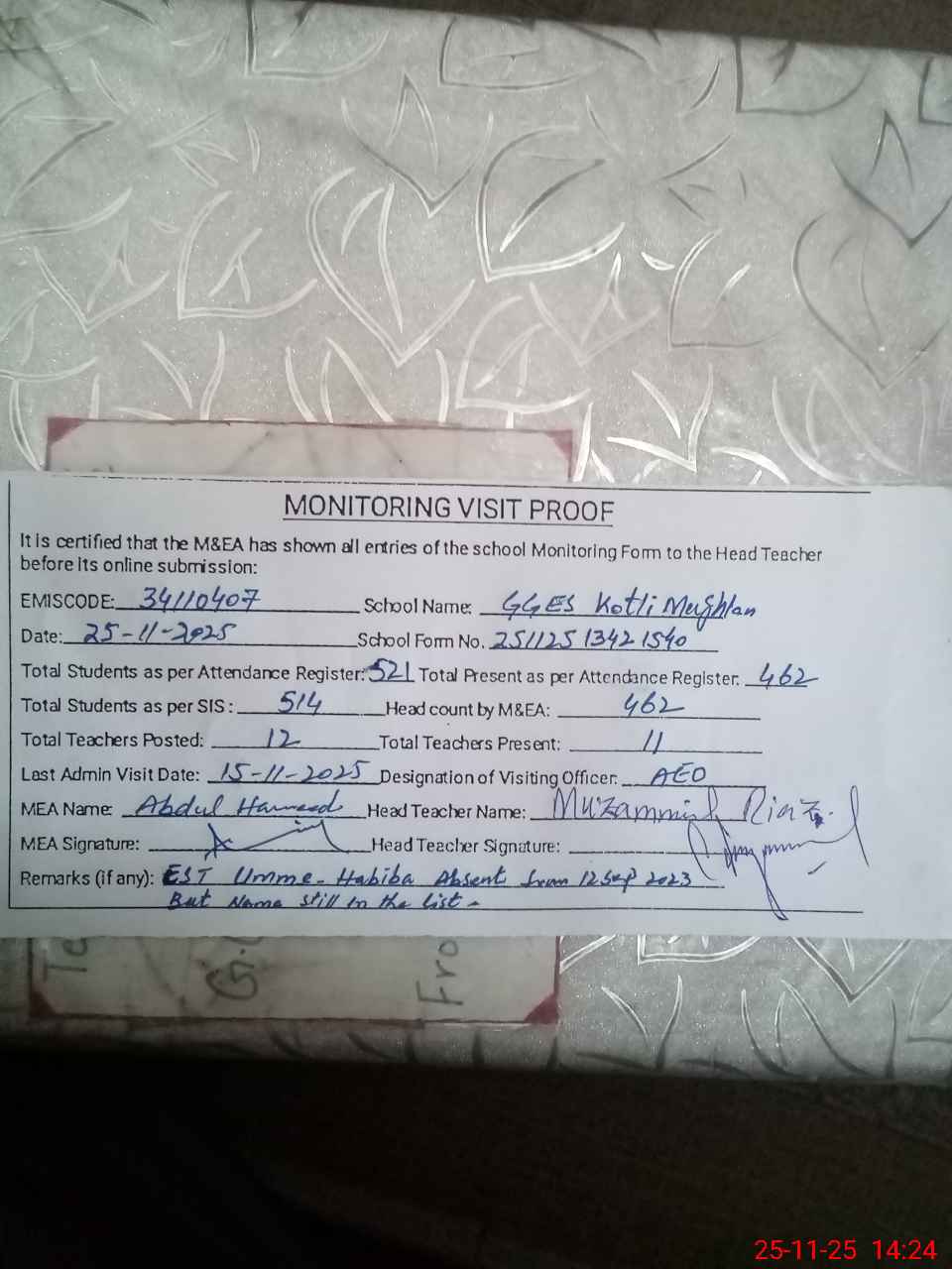 | Attendance Register | Head Teacher | MEA with School | Visit Proof |