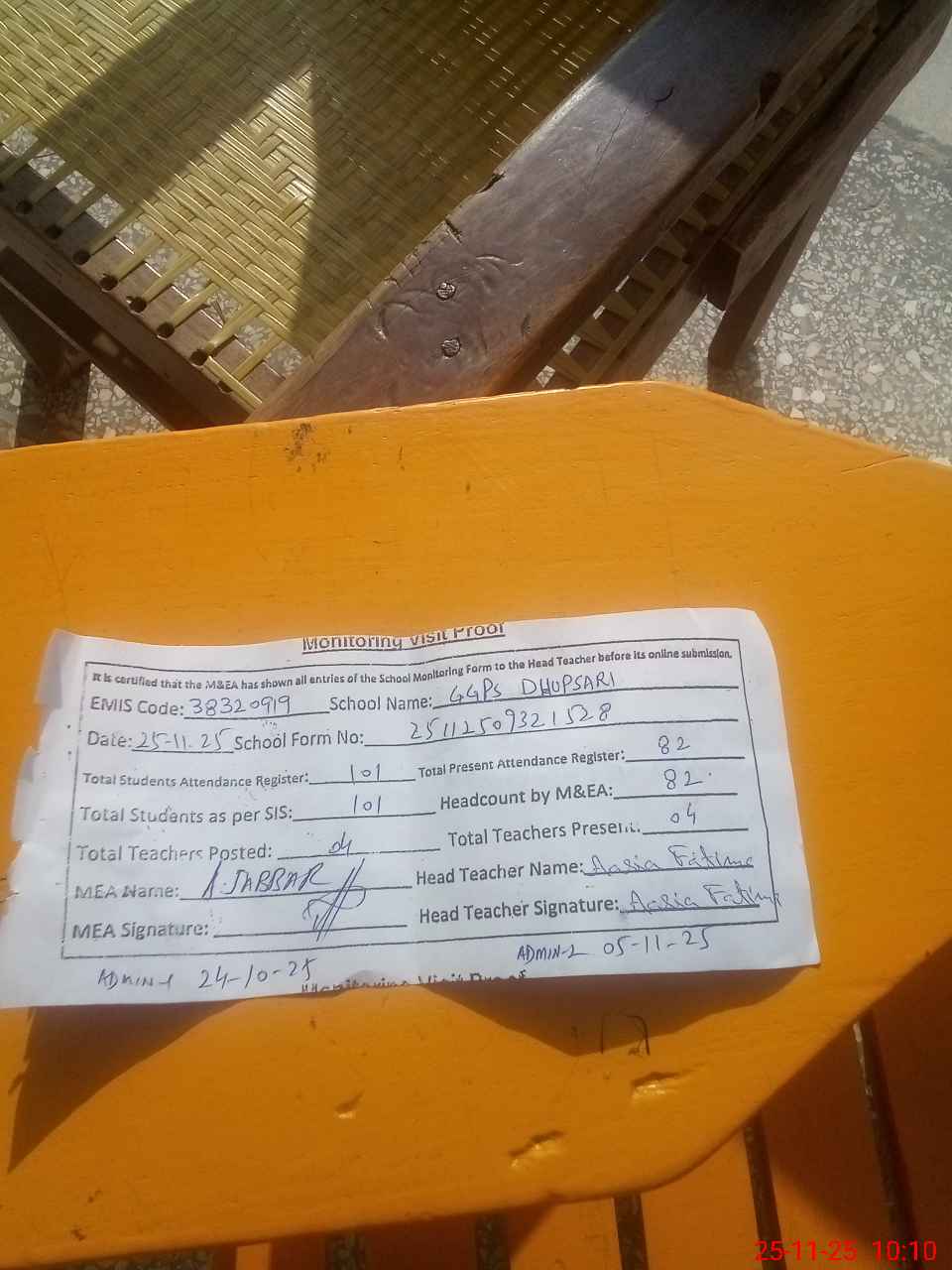 | Attendance Register | Head Teacher | MEA with School | Visit Proof |