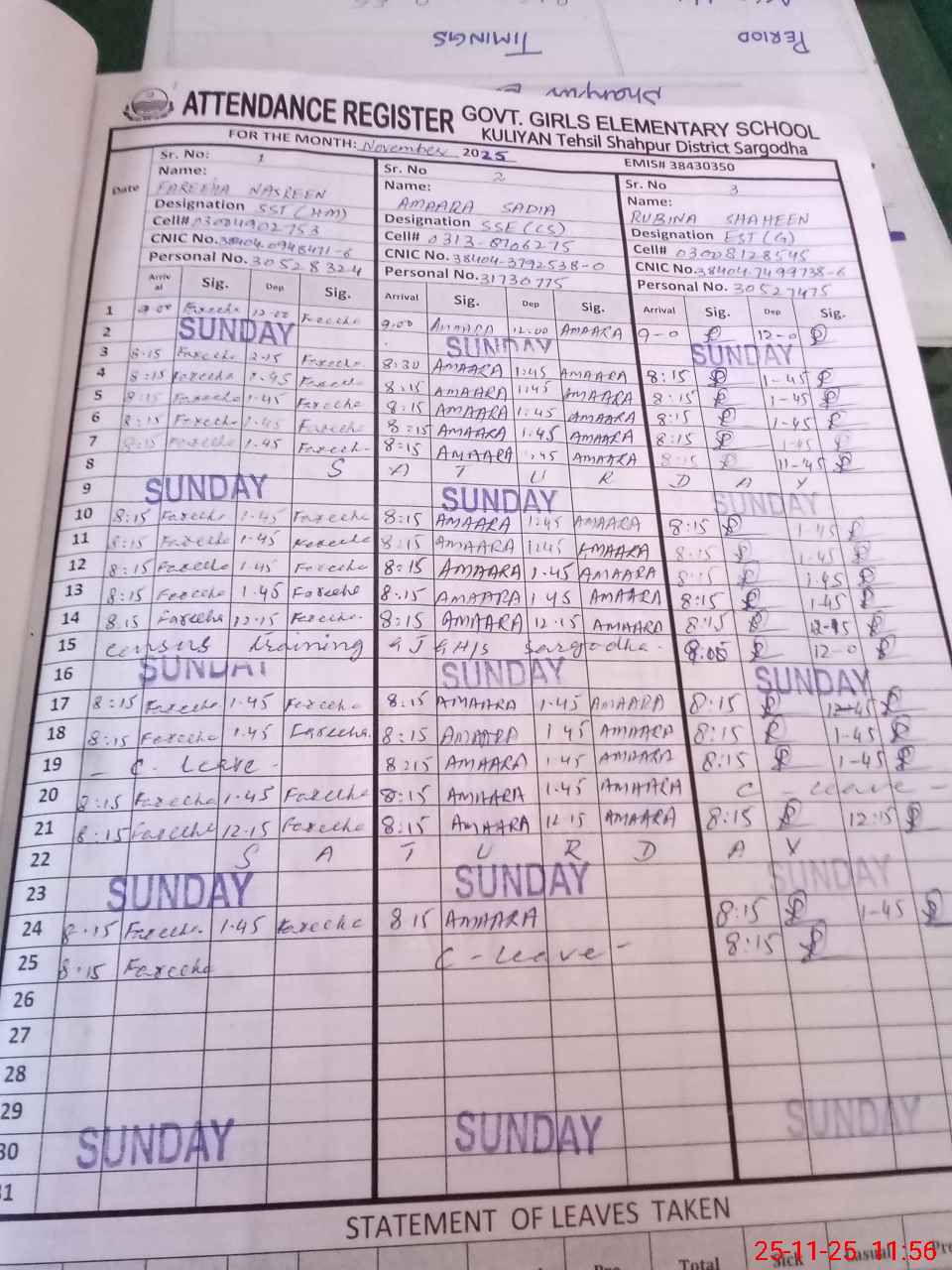 | CNIC | Full Name | Designation | R/C | Absence During Last Calender Month |