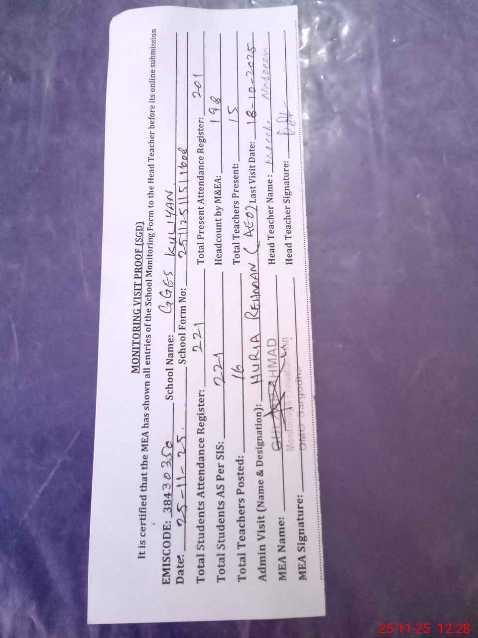 | Attendance Register | Head Teacher | MEA with School | Visit Proof |