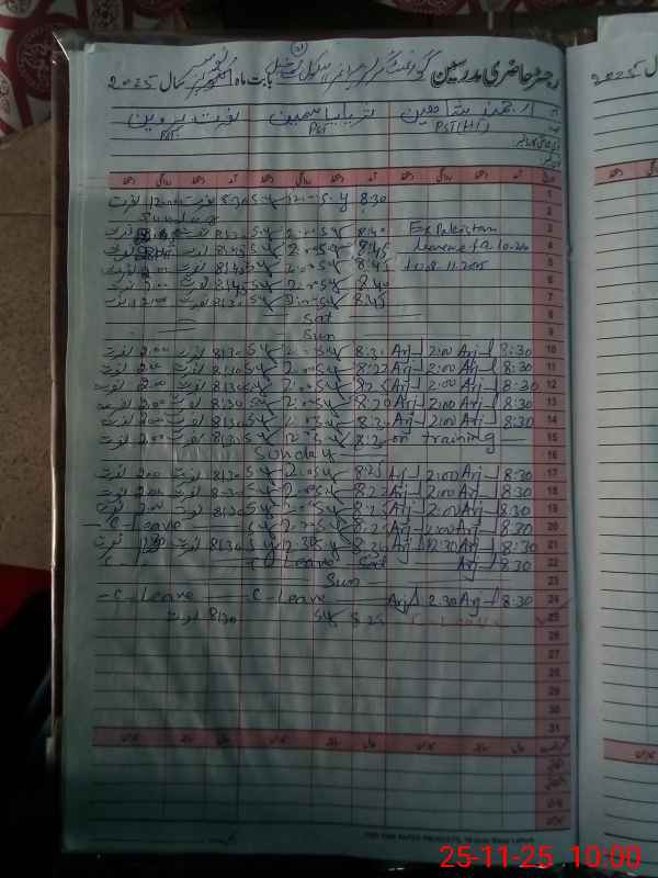 | CNIC | Full Name | Designation | R/C | Absence During Last Calender Month |