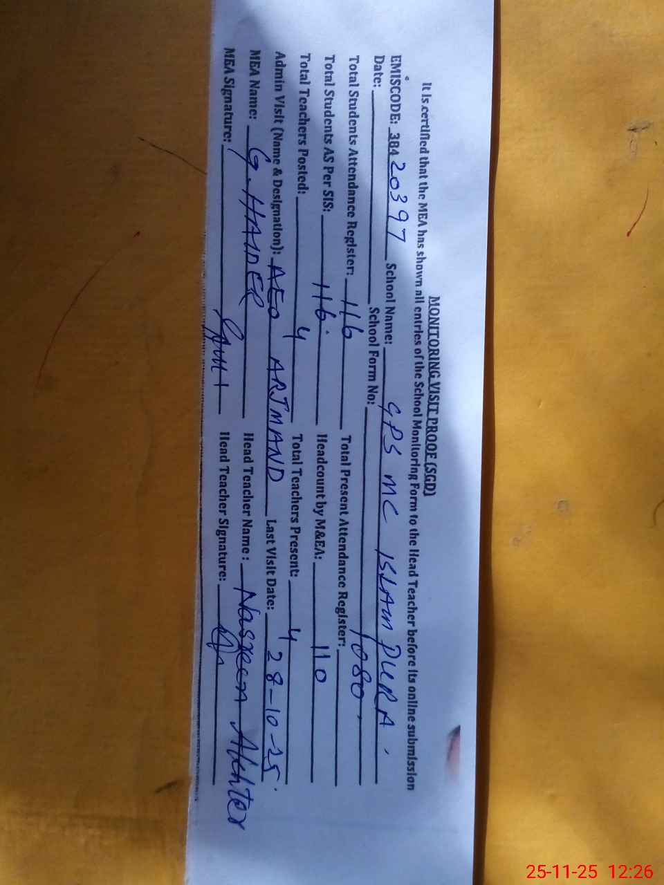 | Attendance Register | Head Teacher | MEA with School | Visit Proof |