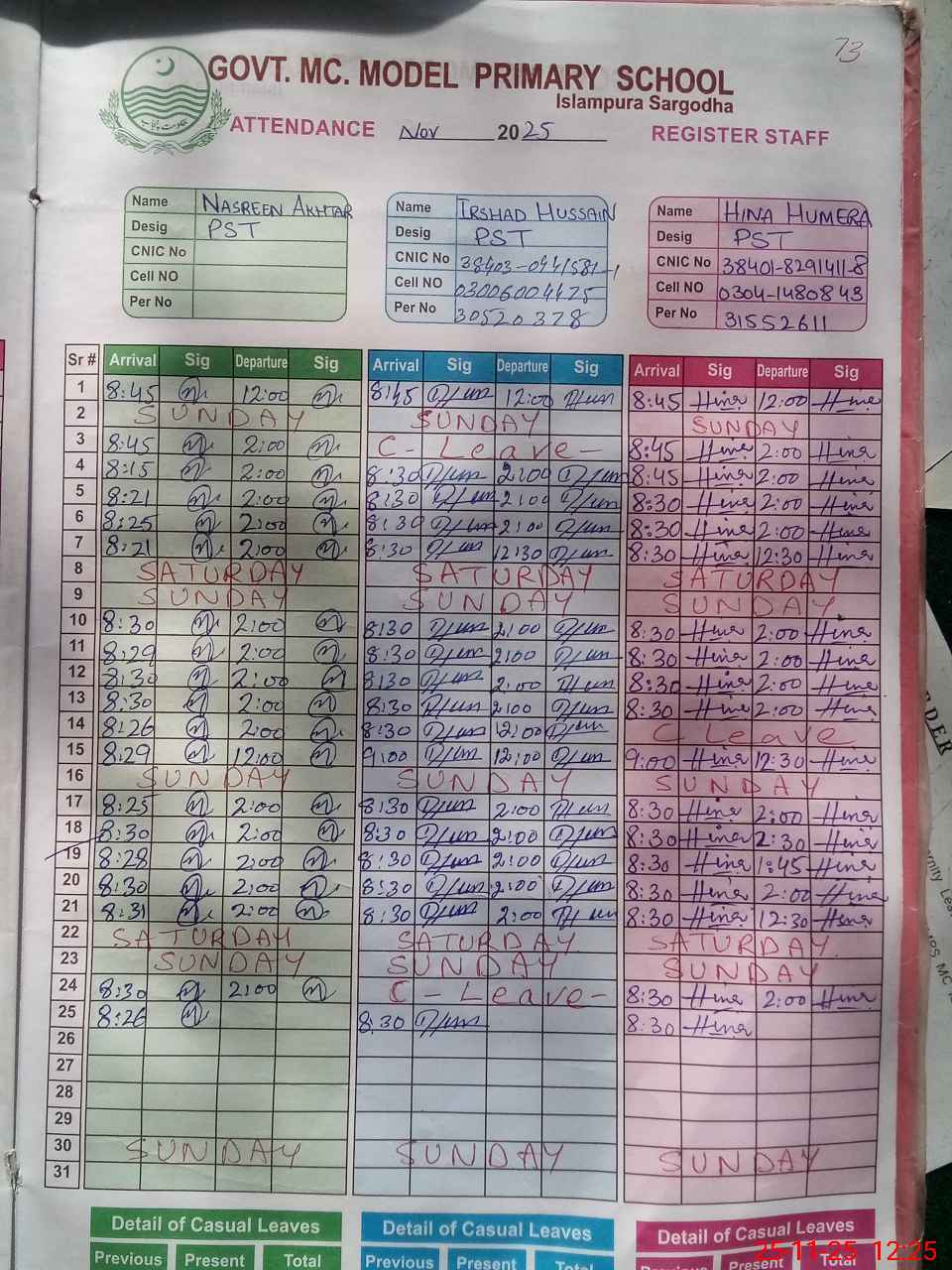 | CNIC | Full Name | Designation | R/C | Absence During Last Calender Month |