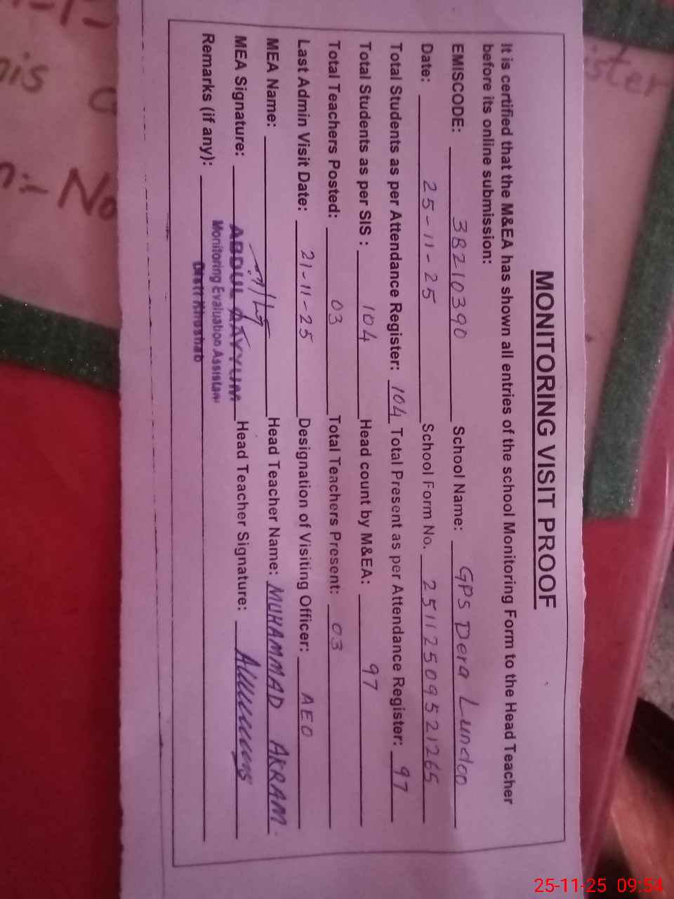 | Attendance Register | Head Teacher | MEA with School | Visit Proof |
