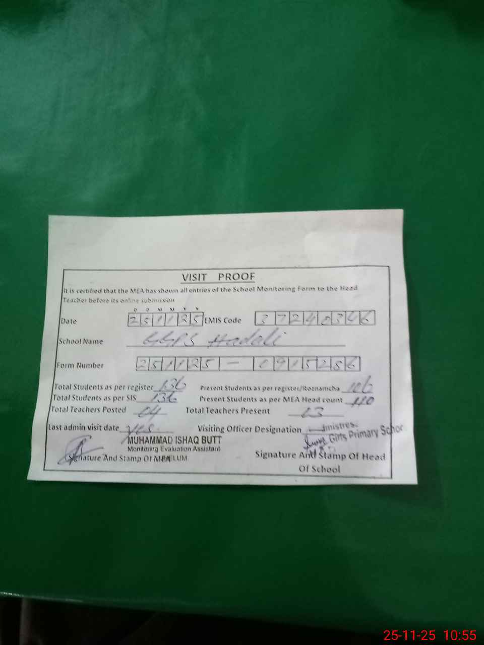 | Attendance Register | Head Teacher | MEA with School | Visit Proof |