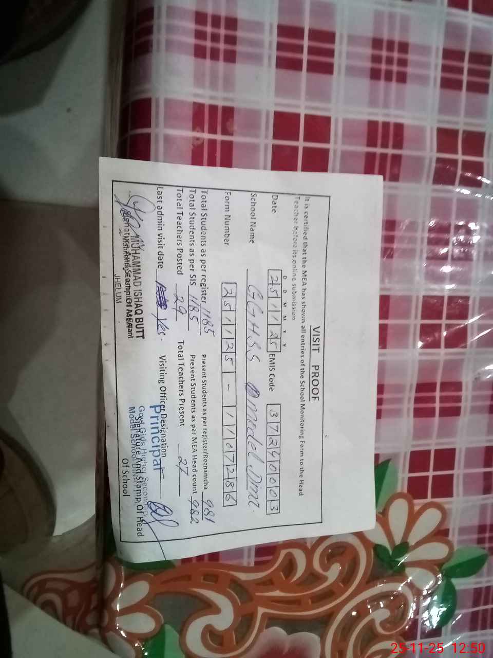| Name: Za**** As**** Designation: (School Headmaster's/Headmistress's) PRINCIPAL Phone/Cell Number: 03**** |