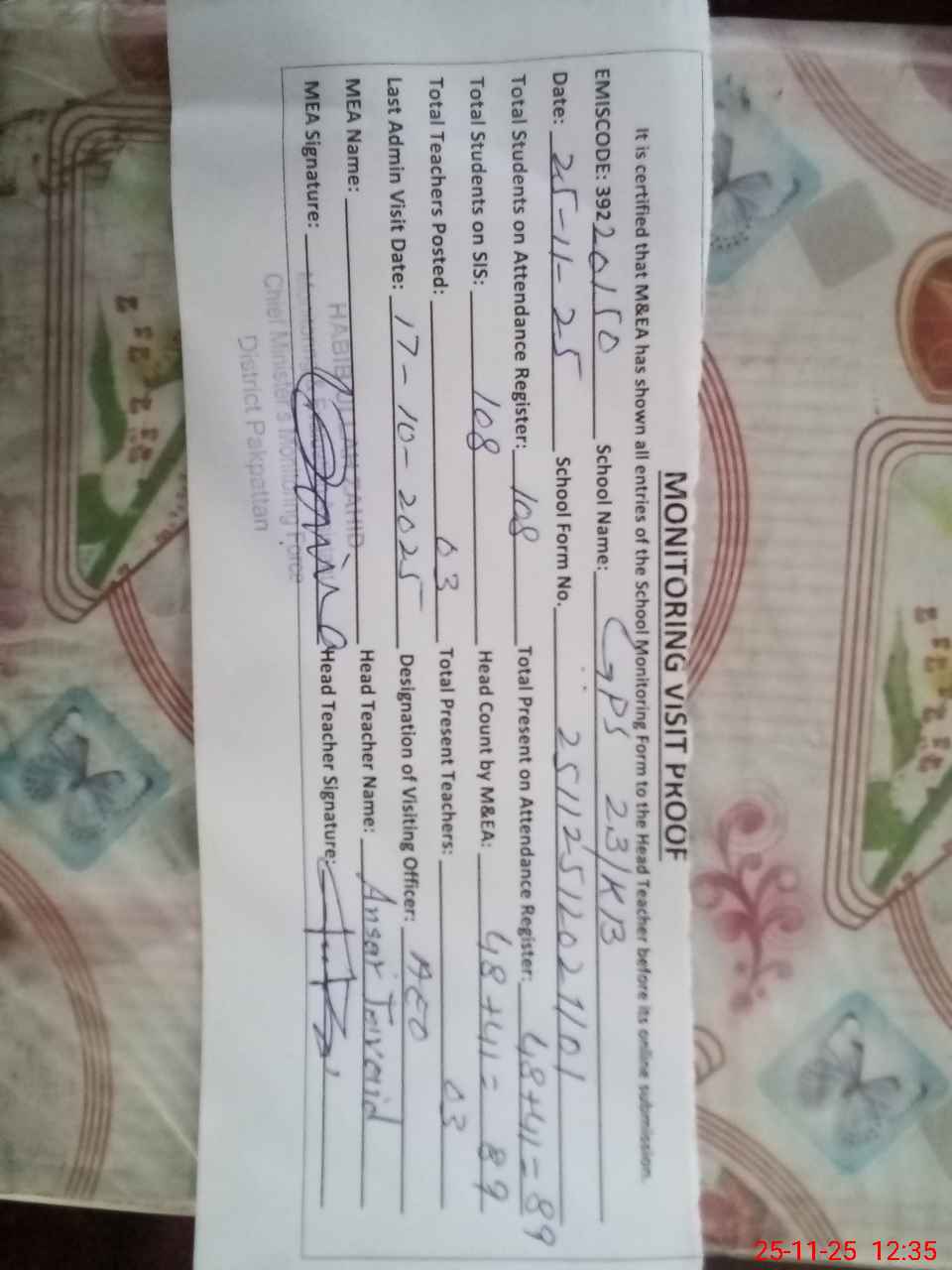 | Attendance Register | Head Teacher | MEA with School | Visit Proof |